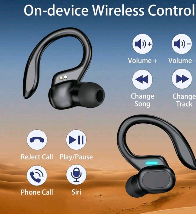 WIRELESS EARBUDS WITH HOOK FOR OUTDOORS ACTIVITIES,BLUETOOTH, FINGEREPRINT SENSOR, LONG LASTING UP TO 5 HOURS WITHOUT CHARGING CASE AND 14 HOURS WITH CHARGING CASE